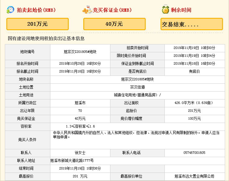 慈宗汉I201805#地块起始价201万元,最终由慈溪市远大置业有限公司以201万元竞得,折合楼面价2948.94元/平方米。