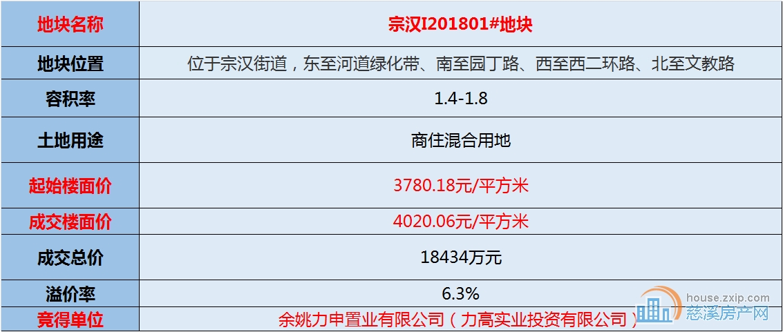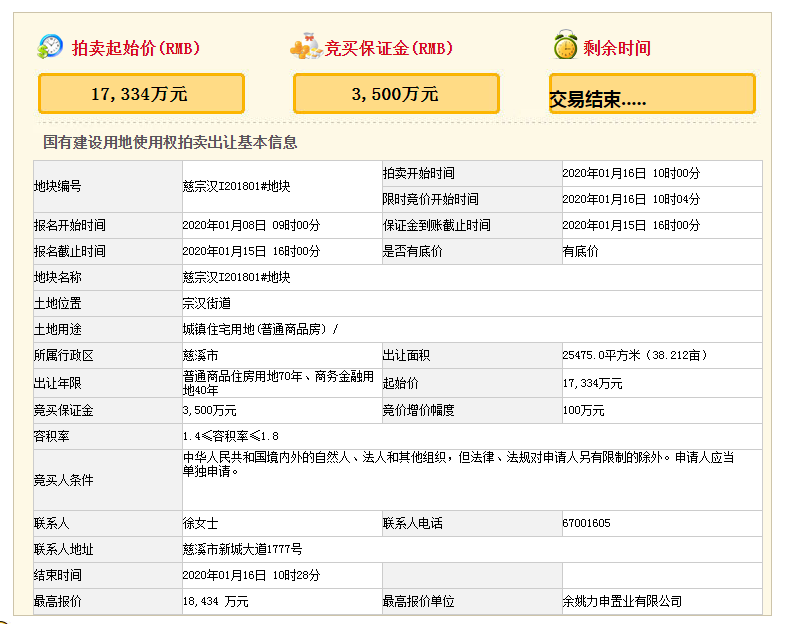 1月16日慈溪土地市场迎来了猪年商品住宅用地的竞拍。上午10点开拍,慈宗汉I201801#地块经过11轮竞拍,由余姚力申置业有限公司(力高实业投资有限公司)竞得,总价18434万元,溢价6.3%。
