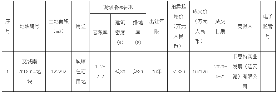 慈溪市自然资源和规划局于2020年4月14日对以下一宗国有建设用地使用权通过浙江省土地使用权网上交易系统进行拍卖出让。现将出让结果公布如下: