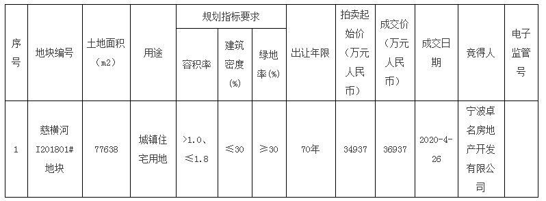 慈横河I201801#地块拍卖出让结果