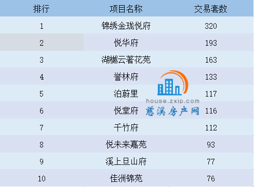 从成交排行榜上看,位于龙山镇的锦绣金珑悦府以320套的成交量夺得6月份慈溪商品住宅交易套数排行的冠军宝座,领跑慈溪楼市,而浒山街道的悦华府以193套的成交量居于亚军位置。紧接着是白沙路街道的湖樾云著花苑,以163套住宅成交量跻身前三甲。