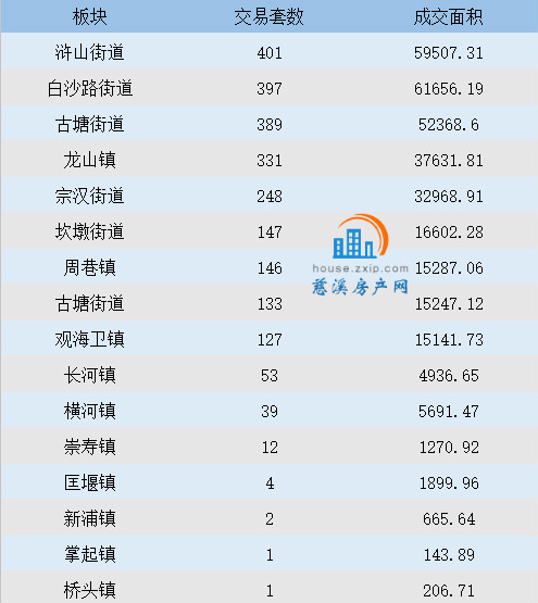 浒山街道以月成交401套居于榜首,其次是白沙路街道以397套的成交量位居第二,古塘街道与龙山镇以389套与331套的数据紧随其后。