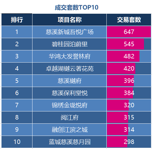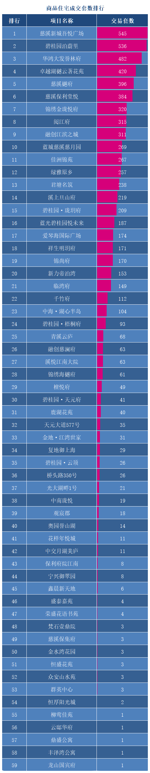 从成交排行榜上看,慈溪新城吾悦广场以545套的成交量成功夺得2020上半年商品住宅交易套排行的冠军桂冠,领跑慈溪楼市。紧接其后的则是位于新城河板块的碧桂园泊蔚里,以536套的成交量居亚军位置。最后是华鸿大发誉林府以482套的成交量跻身前三甲