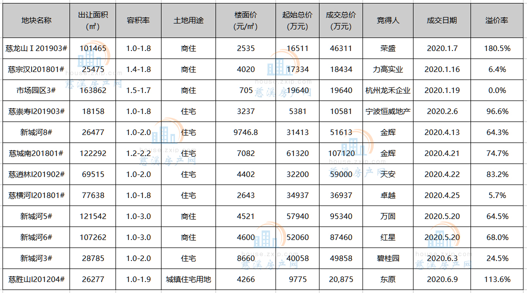 在2020年上半年慈溪的房地产市场中,土地市场也是不得不说的重要一环,甚至在很大程度上,土地市场的状况也影响了未来房地产市场的走势。上半年出让的地块,土地成色均较为不错,也因此吸引了不少优质开发商来慈溪拿地开发。除去工业用地,上半年慈溪市共出让土地12宗,成交12宗,其中城区白沙路街道4宗均为新城河板块;宗汉街道1宗;城南浒山街道1宗。乡镇胜山镇2宗;崇寿镇、龙山镇、逍林镇、横河镇各1宗。