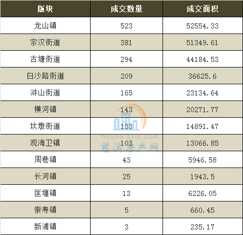 其中,龙山镇以月成交523套居于榜首,归功于栖湖尚府。其次是宗汉街道以381套的成交量位居第二,古塘街道以294套的数据紧随其后。