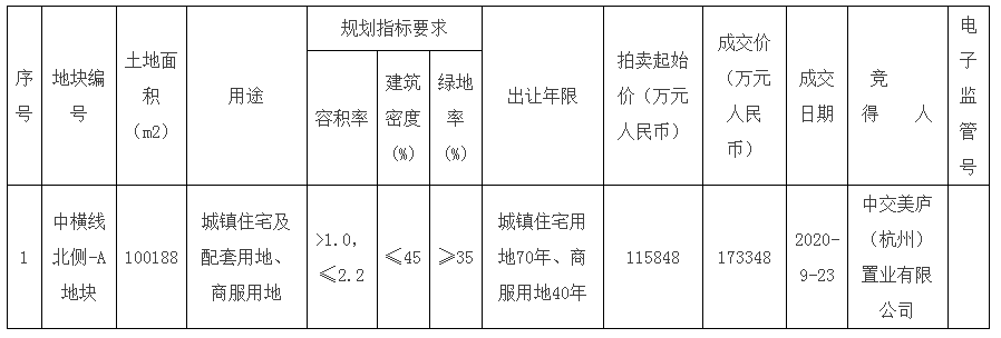 中横线北侧-A地块拍卖出让结果