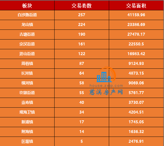 其中,白沙路街道以月成交257套居于榜首,其次是龙山镇以224套的成交量位居第二,古塘街道以190套的数据紧随其后。