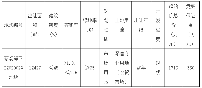 二、出让地块的规划指标、土地用途、出让年限、起始价总价及竞买保证金等如下: