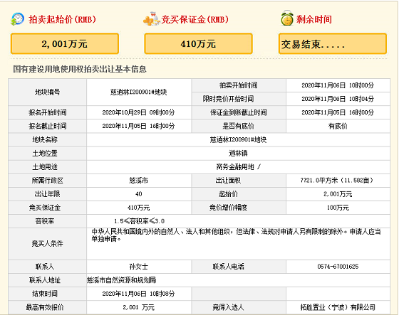 慈逍林I200901#地块今日10点开拍,起始价2001.00万元,起始楼面价864元/㎡,最终由拓胜置业(宁波)有限公司以底价竞得。