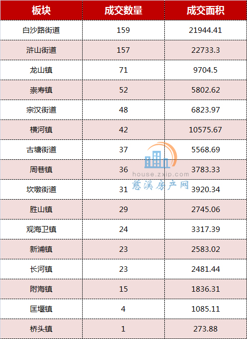 其中,白沙路街道以月成交159套居于榜首,其次是浒山街道以157套的成交量位居第二,龙山镇以71套的数据紧随其后。