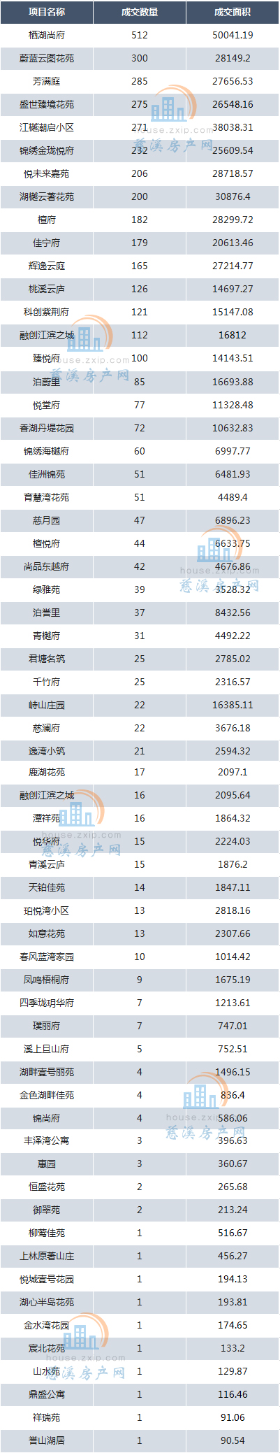 从成交排行榜上看,位于龙山镇的栖湖尚府以512套的成交量、50041.19㎡的成交面积,摘得2021年1月份慈溪商品住宅交易套数和成交面积排行的双桂冠,而蔚蓝云图花苑以300套的成交量夺得成交数量排行第二的宝座。紧接着是芳满庭,以285套住宅成交量跻身前三甲。