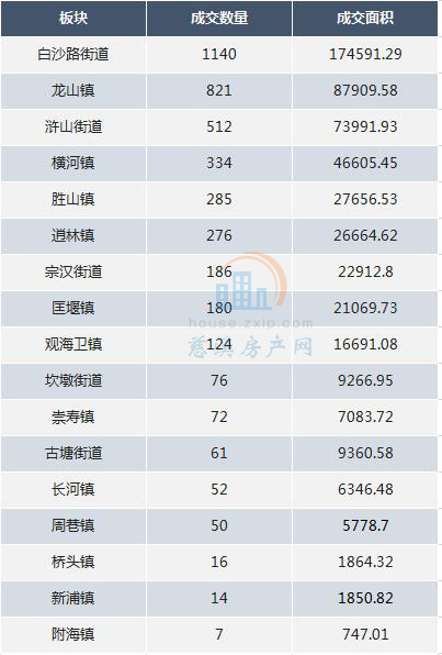 其中,白沙路街道在多个热门楼盘加持下,以月成交1140套居于榜首,其次是龙山镇以821套的成交量位居第二,浒山街道以512套的数据紧随其后。
