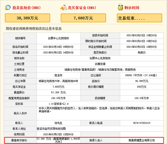 在中午12点02分,经过了72轮的竞拍后,会展中心北侧地块,以总价57389万元,投报面积1900㎡,  楼面价12707.01元/㎡,溢价率49.5%,被南通辉耀置业有限公司(金辉)竞得!
