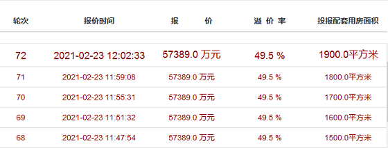 从10点30分开始竞拍后,在第53轮便达到最高报价57389万元,溢价率49.5%。