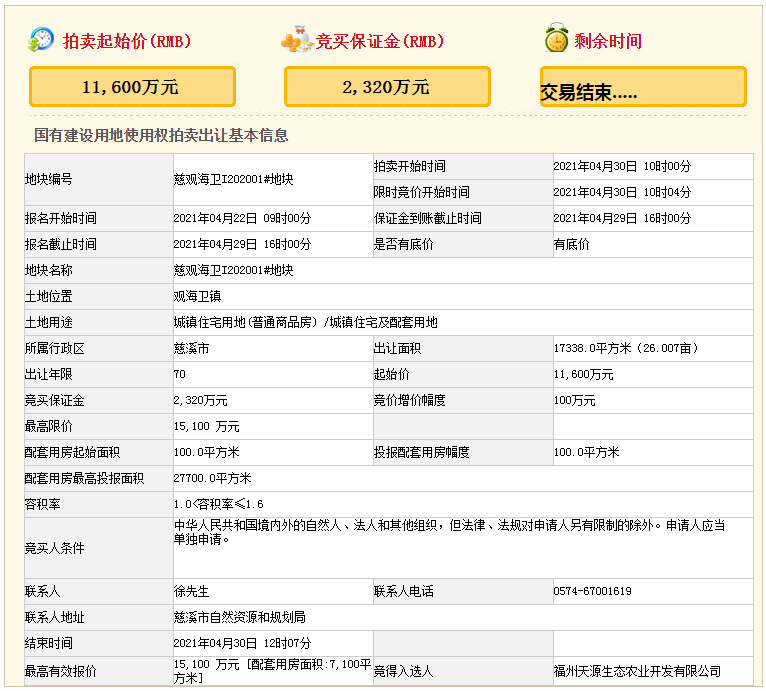 竞得 慈观海卫I202001#地块