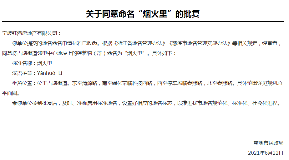 界牌5#地块(古塘街道邻里中心)项目被正式命名为“烟火里”。作为慈溪首个邻里中心项目,已正式进入开工建设阶段。