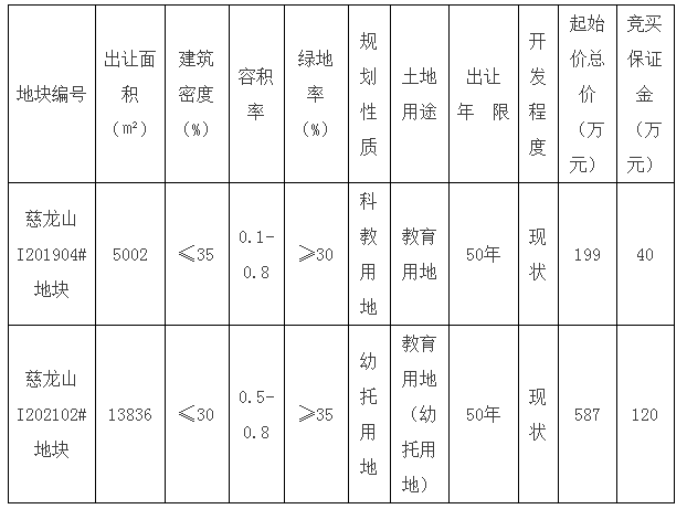 二、出让地块的规划指标、土地用途、出让年限、起始价总价及竞买保证金等如下: