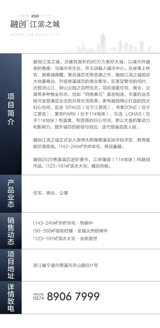 1、融创江滨之城地名办核准名为“江滨之城”,开发公司为:“宁波融鑫臻城置业有限公司”;4-8、11、12号地块预售证为:慈房预许字(2019)第036号、慈房预许字(2019)第037号、慈房预许字(2019)第038号、慈房预许字(2019)第034号、慈房预许字(2020)第032号、慈房预许字(2020)第002号;甬慈房预许字(2021)第012号;
