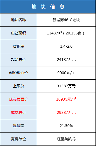 上午10:34新城河46-C地块竞价开始。经过27轮竞价,最终由上海劲米实业有限公司(红星美凯龙)以总价29387万元竞得,楼面价10935元/㎡,溢价率21.5%。目前红星美凯龙在新城河板块已有红星檀府项目。