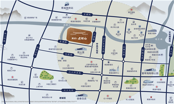 拥有宁波第一医院(慈溪市龙山医院),龙山公交总站、金融中心和众安8万方商业综合体等配套。