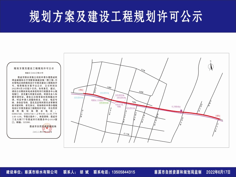 慈溪市排水有限公司拟申请办理慈溪杭湾金融港综合开发配套基础设施一期工程-污水管线迁改的规划设计方案及建设工程规划许可,现将规划方案予以公示。公示时间自2022年6月19日起十日内,如有意见、建议,请在公示期间来电或来信到市行政服务中心规划窗口。涉及重大利害关系的,利害关系人如需申请听证,请在公示结束前向我局提出申请,听证申请人须提供姓名、住址、电话号码、身份证号码、签名及证明利害关系等事项的书面材料。若无异议,我局将依申请办理规划设计方案及建设工程规划许可证。市自然资源和规划局联系电话:63961748、63961746(上午8:00-11:30,下午1:30-4:30,节假日除外),来信请寄:慈溪市三北大街777号慈溪市行政服务中心101#窗口,邮编:315300。