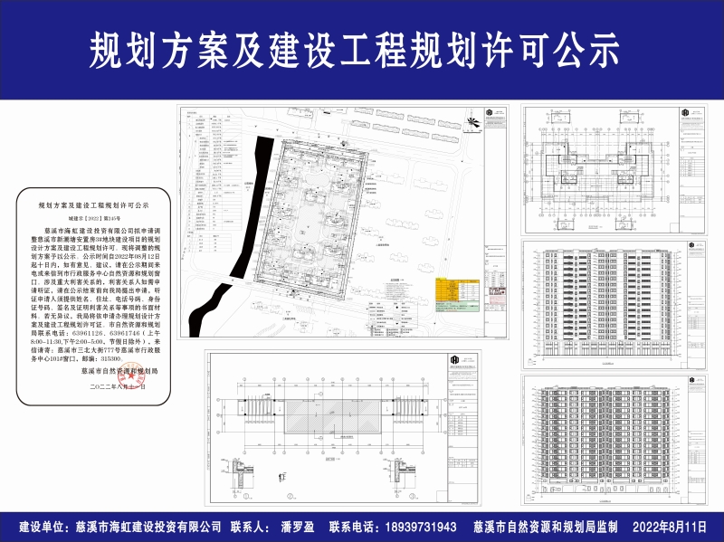 慈溪市海虹建设投资有限公司拟申请调整慈溪市新潮塘安置房3#地块建设项目的规划设计方案及建设工程规划许可。现将调整的规划方案予以公示。公示时间自2022年08月12日起十日内,如有意见、建议,请在公示期间来电或来信到市行政服务中心自然资源和规划窗口。涉及重大利害关系的,利害关系人如需申请听证,请在公示结束前向我局提出申请,听证申请人须提供姓名、住址、电话号码、身份证号码、签名及证明利害关系等事项的书面材料。若无异议,我局将依申请办理规划设计方案及建设工程规划许可证。市自然资源和规划局联系电话:63961126、63961746(上午8:00-11:30,下午2:00-5:00,节假日除外),来信请寄:慈溪市三北大街777号慈溪市行政服务中心101#窗口,邮编:315300。