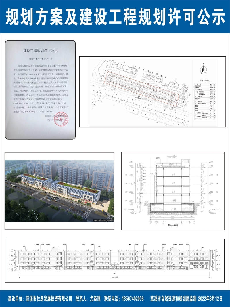 慈溪市住房发展投资有限公司拟申请调整双和1#地块建设项目的规划设计方案,现将调整后规划方案重新予以公示,公示时间自2022年8月13日起十日内,如有意见、建议,请在公示期间来电或来信到市行政服务中心自然资源和规划窗口。涉及重大利害关系的,利害关系人如需申请听证,请在公示结束前向我局提出申请,听证申请人须提供姓名、住址、电话号码、身份证号码、签名及证明利害关系等事项的书面材料。若无异议,我局将依申请办理规划设计方案及建设工程规划许可证。市自然资源和规划局联系电话:63961126、63961748(上午8:00-11:30,下午2:00-5:00,节假日除外),来信请寄:慈溪市三北大街777号慈溪市行政服务中心97#-101#窗口,邮编:315300。