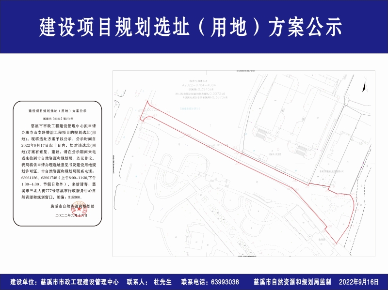 慈溪市市政工程建设管理中心拟申请办理寺山支路整治工程项目的规划选址(用地),现将选址方案予以公示。公示时间自2022年9月17日起十日内,如对该选址(用地)方案有意见、建议,请在公示期间来电或来信到市自然资源和规划局。若无异议,我局将依申请办理选址意见书及建设用地规划许可证。市自然资源和规划局联系电话:63961126、63961748(上午8:00-11:30,下午1:30-4:30,节假日除外),来信请寄:慈溪市三北大街777号慈溪市行政服务中心自然资源和规划窗口,邮编:315300。