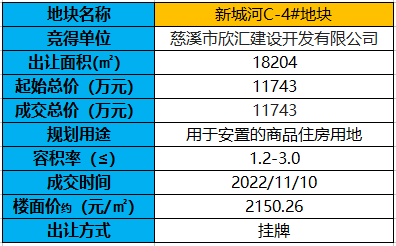 (三)竞得入选人在资格审查前须与市新城河建设办签订《新城河C-4#地块开发监管协议》和《新城河C-4#地块购买协议》,在竞买资格审查时提供该协议。慈溪市新城河建设办公室联系人:翁善杰 联系电话:0574-63980167。