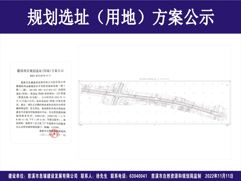 慈溪市息壤建设发展有限公司拟申请办理慈溪杭湾金融港综合开发配套基础设施一期工程(二期)(K9+995.400~K12+832.62)的规划选址(用地),拟选址(用地)地块地址:329国道(影清北路-寺马线)。公示时间自2022年11月12日起十日内,如对该选址(用地)方案有意见、建议,请在公示期间来电或来信到市自然资源和规划局。若无异议,我局将依申请办理选址意见书及建设用地规划许可证。市自然资源和规划局联系电话:63961748、63961746(上午8:00-11:30,下午1:30-4:30,节假日除外),来信请寄:慈溪市三北大街777号慈溪市行政服务中心自然资源和规划窗口,邮编:315300。