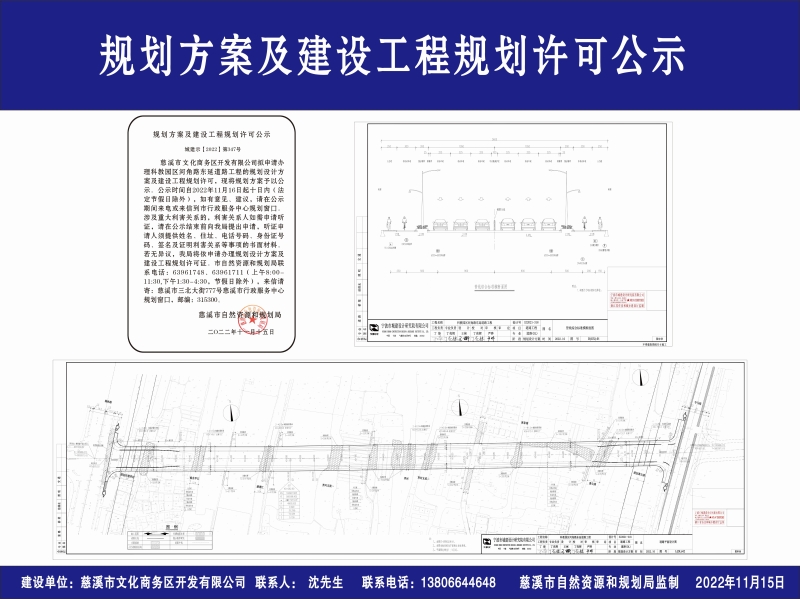 慈溪市文化商务区开发有限公司拟申请办理科教园区河角路东延道路工程的规划设计方案及建设工程规划许可,现将规划方案予以公示。公示时间自2022年11月16日起十日内(法定节假日除外),如有意见、建议,请在公示期间来电或来信到市行政服务中心规划窗口。涉及重大利害关系的,利害关系人如需申请听证,请在公示结束前向我局提出申请,听证申请人须提供姓名、住址、电话号码、身份证号码、签名及证明利害关系等事项的书面材料。若无异议,我局将依申请办理规划设计方案及建设工程规划许可证。市自然资源和规划局联系电话:63961748、63961711(上午8:00-11:30,下午1:30-4:30,节假日除外),来信请寄:慈溪市三北大街777号慈溪市行政服务中心规划窗口,邮编:315300。