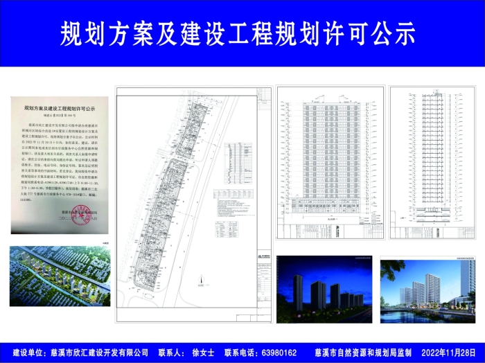 慈溪市欣汇建设开发有限公司拟申请办理慈溪市新城河区块综合改造E#安置房工程的规划设计方案及建设工程规划许可。现将规划方案予以公示。公示时间自2022年11月29日十日内,如有意见、建议,请在公示期间来电或来信到市行政服务中心自然资源和规划窗口。涉及重大利害关系的,利害关系人如需申请听证,请在公示结束前向我局提出申请,听证申请人须提供姓名、住址、电话号码、身份证号码、签名及证明利害关系等事项的书面材料。若无异议,我局将依申请办理规划设计方案及建设工程规划许可证。市自然资源和规划局联系电话:63961126、63961748(上午8:00-11:30,下午1:30-4:30,节假日除外),来信请寄:慈溪市三北大街777号慈溪市行政服务中心97#-101#窗口,邮编:315300。