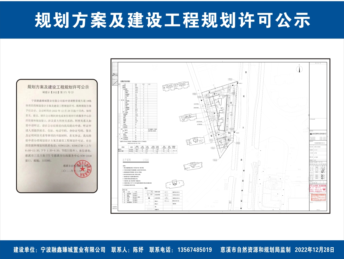 宁波融鑫臻城置业有限公司拟申请调整景观大道1#地块项目的规划设计方案及建设工程规划许可。现将规划方案予以公示。公示时间自2022年12月28日起十日内,如有意见、建议,请在公示期间来电或来信到市行政服务中心自然资源和规划窗口。涉及重大利害关系的,利害关系人如需申请听证,请在公示结束前向我局提出申请,听证申请人须提供姓名、住址、电话号码、身份证号码、签名及证明利害关系等事项的书面材料。若无异议,我局将依申请办理规划设计方案及建设工程规划许可证。市自然资源和规划局联系电话:63961126、63961748(上午8:00-11:30,下午1:30-4:30,节假日除外),来信请寄:慈溪市三北大街777号慈溪市行政服务中心97#-101#窗口,邮编:315300。