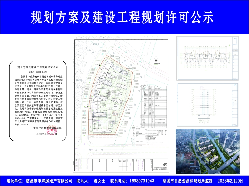 慈溪市中帅房地产有限公司拟申请办理慈城南202201#地块(房地产开发)工程的规划设计方案及建设工程规划许可。现将规划方案予以公示。公示时间自2023年2月22日起十日内,如有意见、建议,请在公示期间来电或来信到市行政服务中心自然资源和规划窗口。涉及重大利害关系的,利害关系人如需申请听证,请在公示结束前向我局提出申请,听证申请人须提供姓名、住址、电话号码、身份证号码、签名及证明利害关系等事项的书面材料。若无异议,我局将依申请办理规划设计方案及建设工程规划许可证。市自然资源和规划局联系电话:63961746、63961739(上午8:00-11:30,下午1:30-4:30,节假日除外),来信请寄:慈溪市三北大街777号慈溪市行政服务中心101#窗口,邮编:315300。