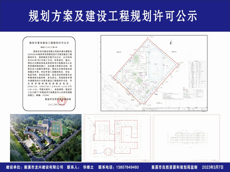 慈溪市龙兴建设有限公司拟申请办理慈龙山I202204#地块项目的规划设计方案及建设工程规划许可。现将规划方案予以公示。公示时间自2023年3月9日起十日内,如有意见、建议,请在公示期间来电或来信到市行政服务中心自然资源和规划窗口。涉及重大利害关系的,利害关系人如需申请听证,请在公示结束前向我局提出申请,听证申请人须提供姓名、住址、电话号码、身份证号码、签名及证明利害关系等事项的书面材料。若无异议,我局将依申请办理规划设计方案及建设工程规划许可证。市自然资源和规划局联系电话:63961739、63961746(上午8:00-11:30,下午1:30-4:30,节假日除外),来信请寄:慈溪市三北大街777号慈溪市行政服务中心自然资源规划窗口,邮编:315300。