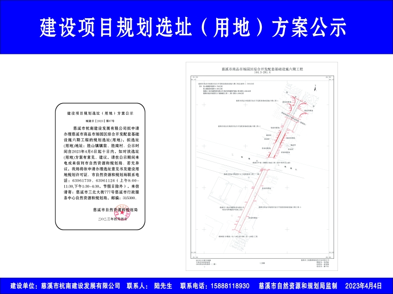 慈溪市杭南建设发展有限公司拟申请办理慈溪市商品市场园区综合开发配套基础设施六期工程的规划选址(用地),拟选址(用地)地址:胜山镇镇前、胜南村。公示时间自2023年4月6日起十日内,如对该选址(用地)方案有意见、建议,请在公示期间来电或来信到市自然资源和规划局。若无异议,我局将依申请办理选址意见书及建设用地规划许可证。市自然资源和规划局联系电话:63961739、63961126(上午8:00-11:30,下午1:30-4:30,节假日除外),来信请寄:慈溪市三北大街777号慈溪市行政服务中心自然资源和规划局,邮编:315300。