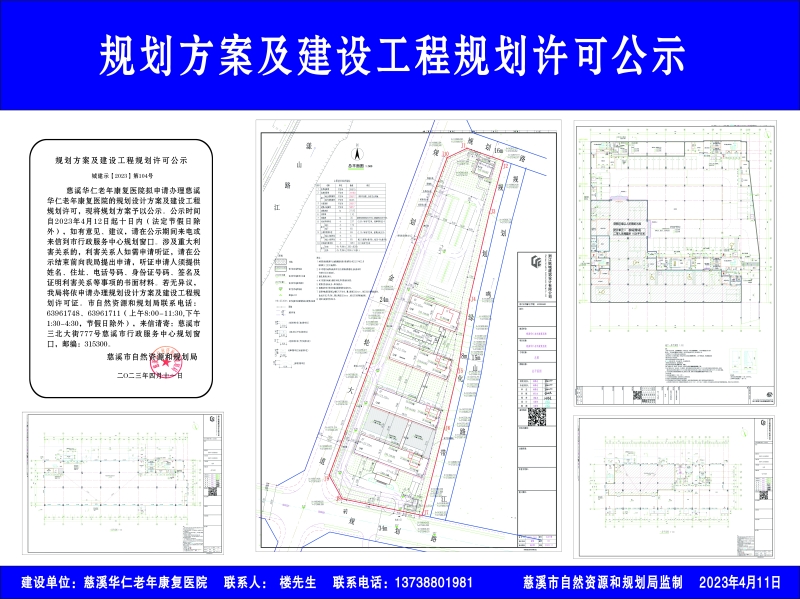 慈溪华仁老年康复医院拟申请办理慈溪华仁老年康复医院的规划设计方案及建设工程规划许可,现将规划方案予以公示。公示时间自2023年4月12日起十日内(法定节假日除外),如有意见、建议,请在公示期间来电或来信到市行政服务中心规划窗口。涉及重大利害关系的,利害关系人如需申请听证,请在公示结束前向我局提出申请,听证申请人须提供姓名、住址、电话号码、身份证号码、签名及证明利害关系等事项的书面材料。若无异议,我局将依申请办理规划设计方案及建设工程规划许可证。市自然资源和规划局联系电话:63961748、63961711(上午8:00-11:30,下午1:30-4:30,节假日除外),来信请寄:慈溪市三北大街777号慈溪市行政服务中心规划窗口,邮编:315300。