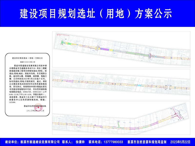 慈溪市慈通建设发展有限公司拟申请办理慈溪市交通服务导向TOD 项目二期配套基础设施工程项目的规划选址(用地),拟选址(用地)地址:西起寺马线,东至观附公路,途径桥头镇、附海镇、逍林镇、观海卫镇。公示时间自2023年5月24日起十日内,如对该选址(用地)方案有意见、建议,请在公示期间来电或来信到市自然资源和规划局。若无异议,我局将依申请办理选址意见书及建设用地规划许可证。市自然资源和规划局联系电话:63961739、63961126(上午8:00-11:30,下午1:30-4:30,节假日除外),来信请寄:慈溪市三北大街777号慈溪市行政服务中心自然资源和规划局,邮编:315300。