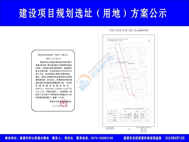 慈溪市浒山街道办事处拟申请办理下房路(慈百路-南大路)建设工程的规划选址(用地),拟选址(用地)地块地址:南起慈百路,北至南大路。公示时间自2023年6月13日起十日内,如对该选址(用地)方案有意见、建议,请在公示期间来电或来信到市自然资源和规划局。若无异议,我局将依申请办理选址意见书及建设用地规划许可证。市自然资源和规划局联系电话:63961711、63961746(上午8:00-11:30,下午1:30-4:30,节假日除外),来信请寄:慈溪市三北大街777号慈溪市行政服务中心自然资源和规划窗口,邮编:315300。
