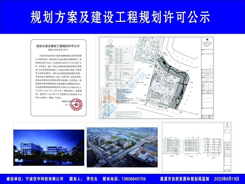 宁波优宇科技有限公司拟申请调整润园文创空间(新城河10#地块项目)的规划设计方案及建设工程规划许可,现将规划方案予以公示。公示时间自2023年6月20日起十日内,如有意见、建议,请在公示期间来电或来信到市行政服务中心自然资源和规划窗口。涉及重大利害关系的,利害关系人如需申请听证,请在公示结束前向我局提出申请,听证申请人须提供姓名、住址、电话号码、身份证号码、签名及证明利害关系等事项的书面材料。若无异议,我局将依申请办理规划设计方案及建设工程规划许可证。市自然资源和规划局联系电话:63961126、63961739(上午8:00-11:30,下午1:30-4:30,节假日除外),来信请寄:慈溪市三北大街777号慈溪市行政服务中心97#-101#窗口,邮编:315300。