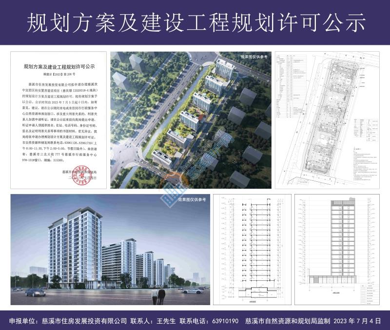 慈溪市住房发展投资有限公司拟申请办理慈溪坎中宜居区块安置房建设项目(慈坎墩I202001#-A地块)的规划设计方案及建设工程规划许可,现将规划方案予以公示。公示时间自2023年7月5日起十日内,如有意见、建议,请在公示期间来电或来信到市行政服务中心自然资源和规划窗口。涉及重大利害关系的,利害关系人如需申请听证,请在公示结束前向我局提出申请,听证申请人须提供姓名、住址、电话号码、身份证号码、签名及证明利害关系等事项的书面材料。若无异议,我局将依申请办理规划设计方案及建设工程规划许可证。市自然资源和规划局联系电话:63961126、63961739(上午8:00-11:30,下午2:00-5:00,节假日除外),来信请寄:慈溪市三北大街777号慈溪市行政服务中心97#-101#窗口,邮编:315300。