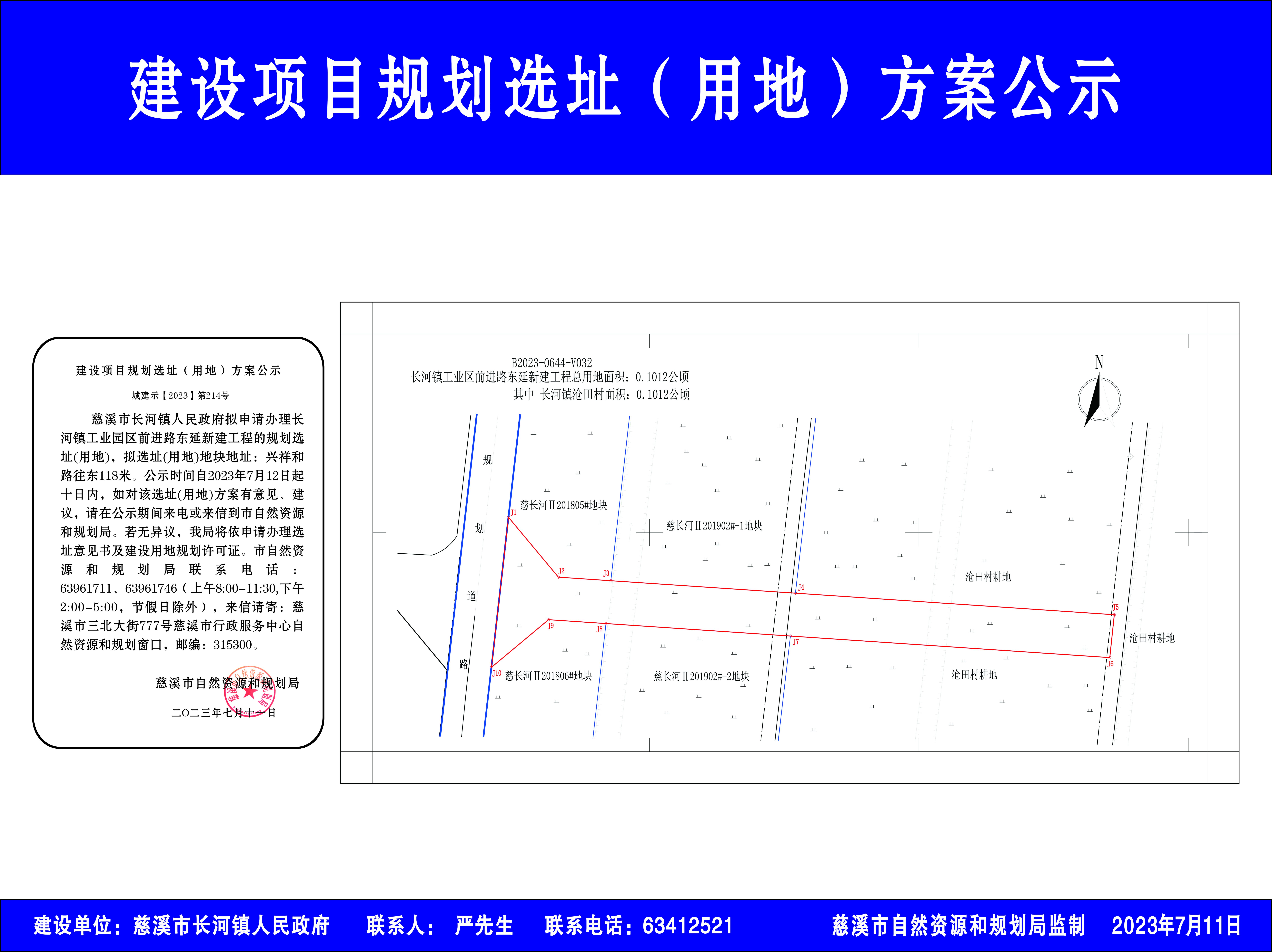慈溪市长河镇人民政府拟申请办理长河镇工业园区前进路东延新建工程的规划选址(用地),拟选址(用地)地块地址:兴祥和路往东118米。公示时间自2023年7月12日起十日内,如对该选址(用地)方案有意见、建议,请在公示期间来电或来信到市自然资源和规划局。若无异议,我局将依申请办理选址意见书及建设用地规划许可证。市自然资源和规划局联系电话:63961711、63961746(上午8:00-11:30,下午2:00-5:00,节假日除外),来信请寄:慈溪市三北大街777号慈溪市行政服务中心自然资源和规划窗口,邮编:315300。