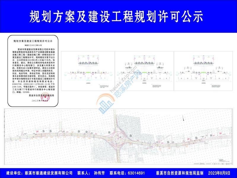 慈溪市慈通建设发展有限公司拟申请办理慈溪智能家电高新技术产业园建设配套基础设施三期工程(基础设施三期)的规划设计方案及建设工程规划许可,现将规划方案予以公示。公示时间自2023年8月11日起十日内,如有意见、建议,请在公示期间来电或来信到市行政服务中心规划窗口。涉及重大利害关系的,利害关系人如需申请听证,请在公示结束前向我局提出申请,听证申请人须提供姓名、住址、电话号码、身份证号码、签名及证明利害关系等事项的书面材料。若无异议,我局将依申请办理规划设计方案及建设工程规划许可证。市自然资源和规划局联系电话:63961739、63961126(上午8:00-11:30,下午2:00-5:00,节假日除外),来信请寄:慈溪市三北大街777号慈溪市行政服务中心规划窗口,邮编:315300。