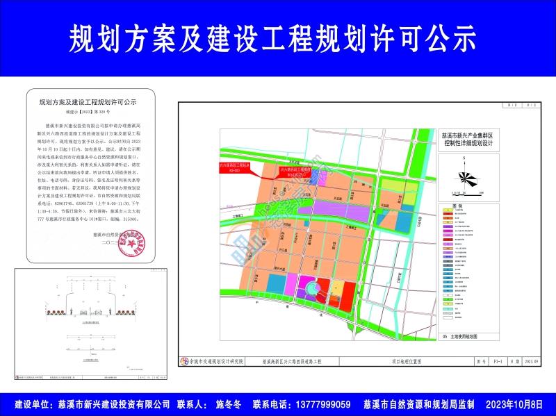 慈溪市新兴建设投资有限公司拟申请办理慈溪高新区兴六路西段道路工程的规划设计方案及建设工程规划许可。现将规划方案予以公示。公示时间自2023年10月10日起十日内,如有意见、建议,请在公示期间来电或来信到市行政服务中心自然资源和规划窗口。涉及重大利害关系的,利害关系人如需申请听证,请在公示结束前向我局提出申请,听证申请人须提供姓名、住址、电话号码、身份证号码、签名及证明利害关系等事项的书面材料。若无异议,我局将依申请办理规划设计方案及建设工程规划许可证。市自然资源和规划局联系电话:63961746、63961739(上午8:00-11:30,下午1:30-4:30,节假日除外),来信请寄:慈溪市三北大街777号慈溪市行政服务中心101#窗口,邮编:315300。