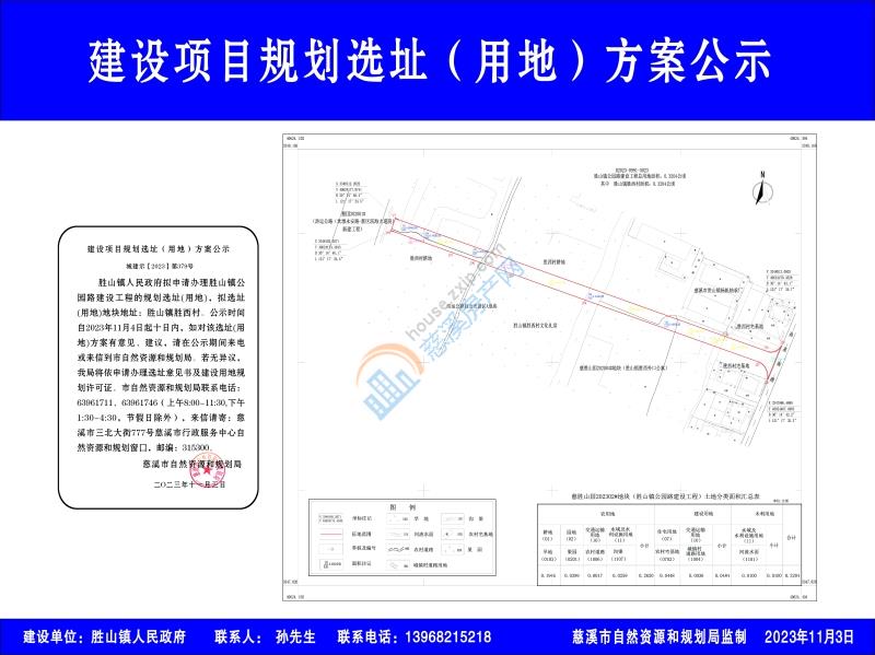 胜山镇人民政府拟申请办理胜山镇公园路建设工程的规划选址(用地),拟选址(用地)地块地址:胜山镇胜西村。公示时间自2023年11月4日起十日内,如对该选址(用地)方案有意见、建议,请在公示期间来电或来信到市自然资源和规划局。若无异议,我局将依申请办理选址意见书及建设用地规划许可证。市自然资源和规划局联系电话:63961711、63961746(上午8:00-11:30,下午1:30-4:30,节假日除外),来信请寄:慈溪市三北大街777号慈溪市行政服务中心自然资源和规划窗口,邮编:315300。