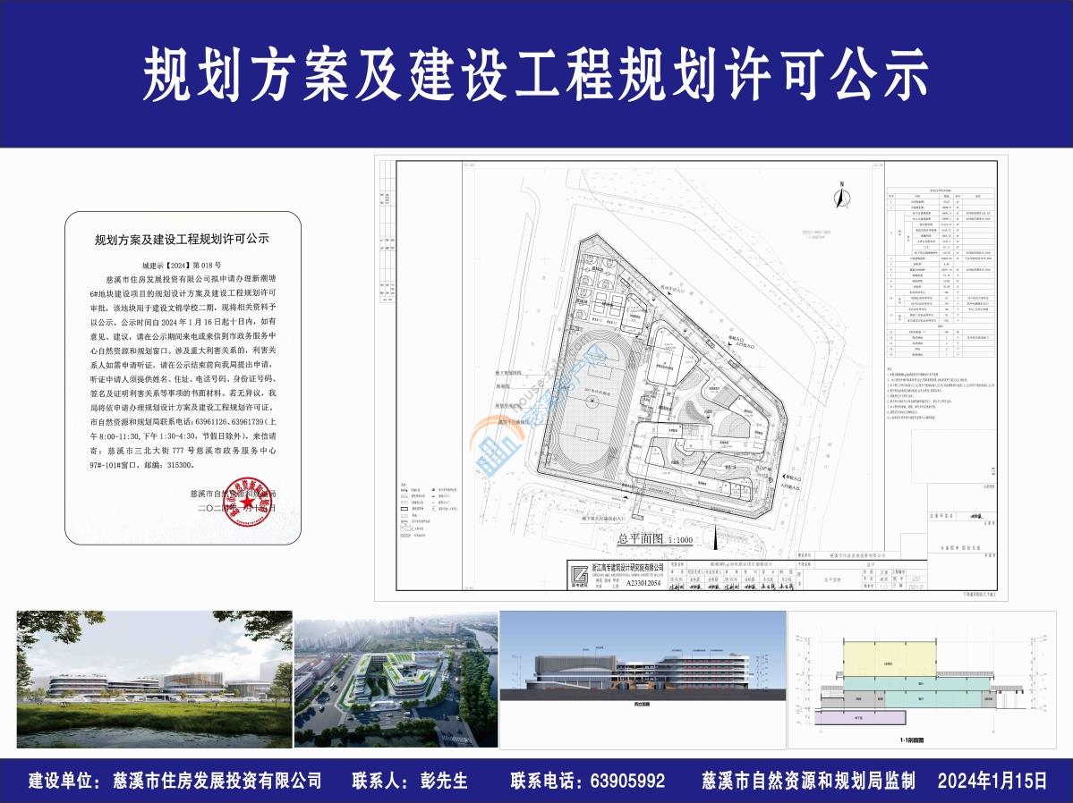 慈溪市住房发展投资有限公司拟申请办理新潮塘6#地块建设项目的规划设计方案及建设工程规划许可审批,该地块用于建设文锦学校二期,现将相关资料予以公示。公示时间自2024年1月16日起十日内,如有意见、建议,请在公示期间来电或来信到市政务服务中心自然资源和规划窗口。涉及重大利害关系的,利害关系人如需申请听证,请在公示结束前向我局提出申请,听证申请人须提供姓名、住址、电话号码、身份证号码、签名及证明利害关系等事项的书面材料。若无异议,我局将依申请办理规划设计方案及建设工程规划许可证。市自然资源和规划局联系电话:63961126、63961739(上午8:00-11:30,下午1:30-4:30,节假日除外),来信请寄:慈溪市三北大街777号慈溪市政务服务中心97#-101#窗口,邮编:315300。