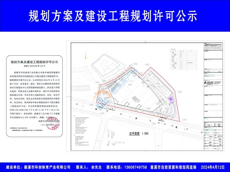 慈溪市环创体育产业有限公司拟申请变更慈溪市体育健身馆项目的规划设计方案及建设工程规划许可,现将规划方案予以公示。公示时间自2024年4月13日起十日内,如有意见、建议,请在公示期间来电或来信到市行政服务中心自然资源和规划窗口。涉及重大利害关系的,利害关系人如需申请听证,请在公示结束前向我局提出申请,听证申请人须提供姓名、住址、电话号码、身份证号码、签名及证明利害关系等事项的书面材料。若无异议,我局将依申请办理规划设计方案及建设工程规划许可证。市自然资源和规划局联系电话:63961126、63961739(上午8:00-11:30,下午1:30-4:30,节假日除外),来信请寄:慈溪市三北大街777号慈溪市行政服务中心97#-101#窗口,邮编:315300。