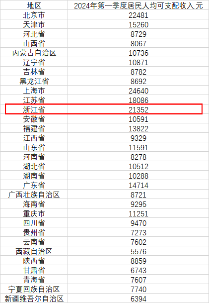 一季度,浙江省居民人均可支配收入21352元,同比名义增长5.9%,扣除价格因素实际增长6.0%。