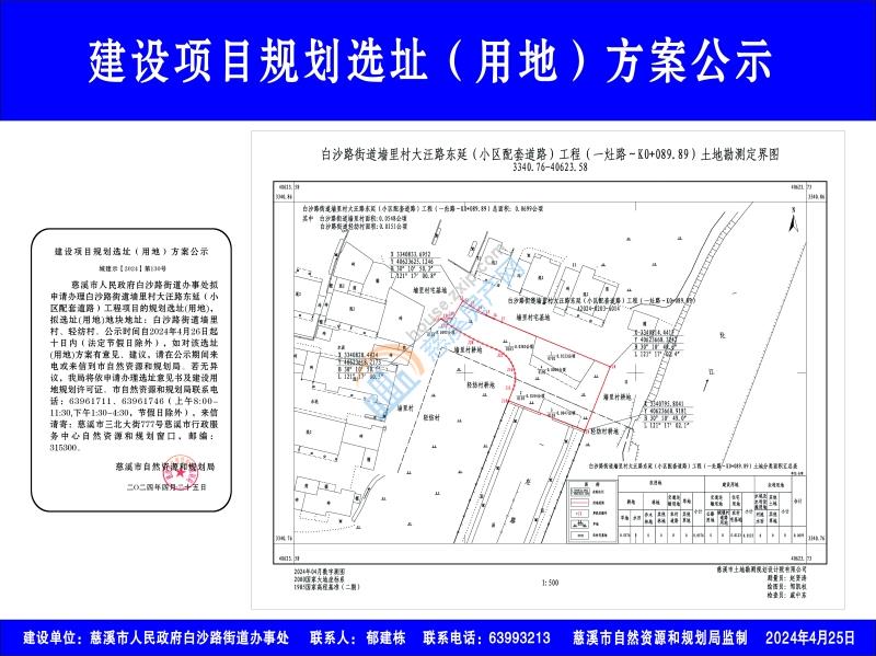 慈溪市人民政府白沙路街道办事处拟申请办理白沙路街道墙里村大汪路东延(小区配套道路)工程项目的规划选址(用地),拟选址(用地)地块地址:白沙路街道墙里村、轻纺村。公示时间自2024年4月26日起十日内(法定节假日除外),如对该选址(用地)方案有意见、建议,请在公示期间来电或来信到市自然资源和规划局。若无异议,我局将依申请办理选址意见书及建设用地规划许可证。市自然资源和规划局联系电话:63961711、63961746(上午8:00-11:30,下午1:30-4:30,节假日除外),来信请寄:慈溪市三北大街777号慈溪市行政服务中心自然资源和规划窗口,邮编:315300。