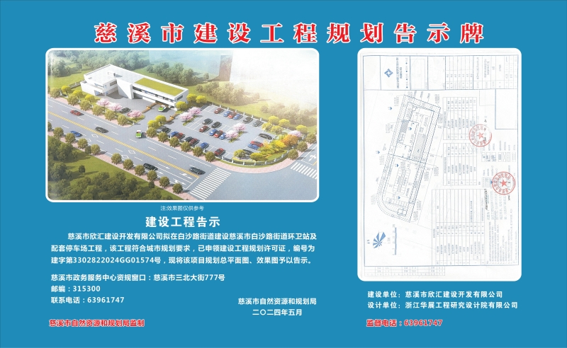 慈溪市欣汇建设开发有限公司拟在白沙路街道建设慈溪市白沙路街道环卫站及配套停车场工程项目,该工程符合城市规划要求,已申领建设工程规划许可证,编号为建字第3302822024GG0157419号,现将该项目规划总平面图、效果图予以告示。